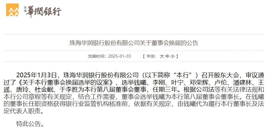 领有央企配景的华润银行终于“换帅”。2025年1月3日,珠海华润银行召开推动大会,审议通过了《对于本行董事会换届选举的议案》,选举钱曦、李刚、叶宁、邓荣辉、卢伦、潘建林、王遥、唐玲、杜金岷、于李胜为本行第八届董事会董事,任期三年。